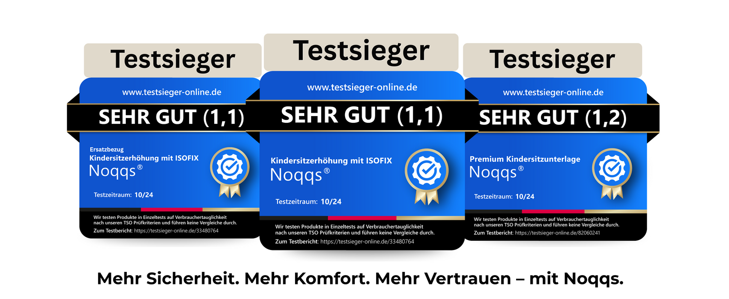 Noqqs® Kindersitzerhöhungen überzeugen durch höchste Qualität, Sicherheit und Funktionalität – bestätigt durch zwei unabhängige Testsiegel mit Bestnote